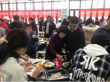 活动当天,约900名师生共聚桃园翠山餐厅、巨百餐厅,大家撸起衣袖,带上围裙,随着和面、擀面、包馅等一系列动作,热气腾腾的饺子在大家的期待中被端上了餐桌,师生们一个个迫不及待地拿起碗筷在第一时间品尝自己亲手包的饺子。