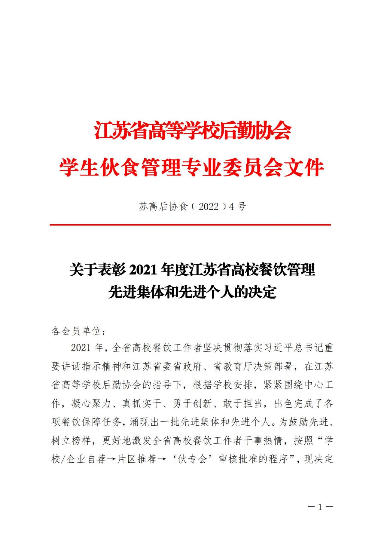 近日,江苏省高等学校后勤协会学生伙食管理专业委员会印发文件《关于表彰2021年度江苏省高校餐饮管理先进集体和先进个人的决定》(苏高后协食〔2022〕4号),无锡学院后勤管理处荣获2021年度江苏省高校餐饮管理“先进集体”称号。
