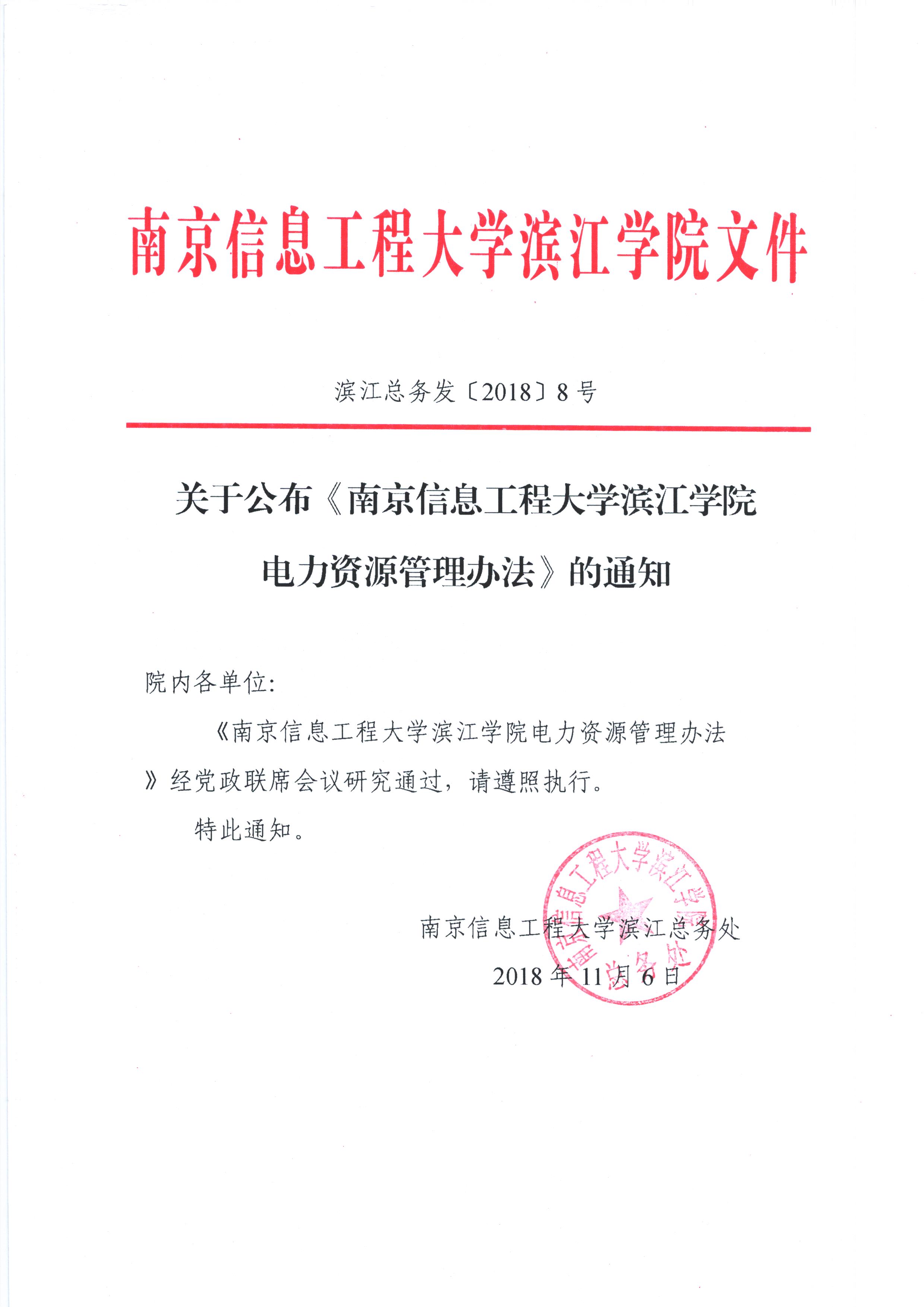关于公布《南京信息工程大学滨江学院电力资源管理办法》的通知