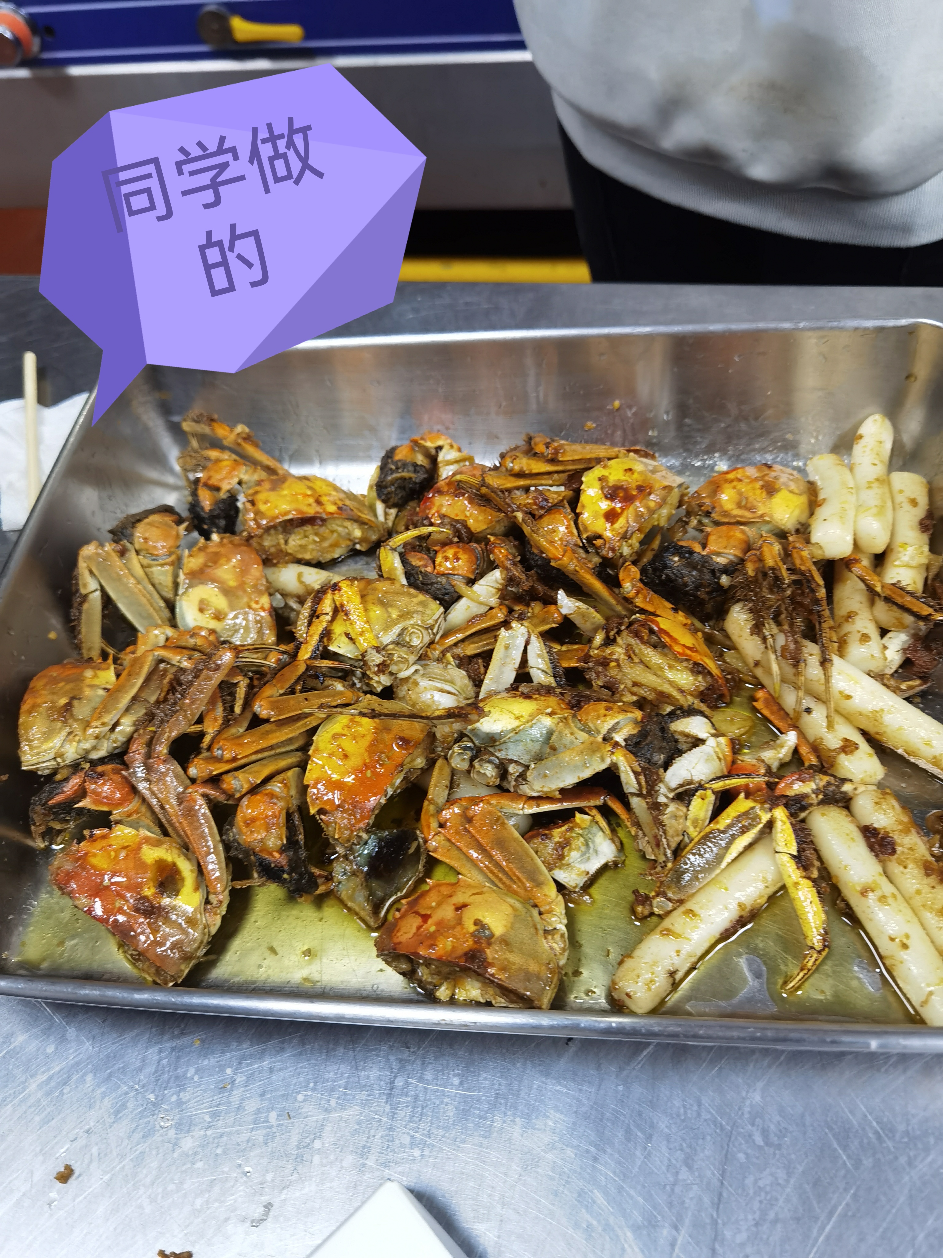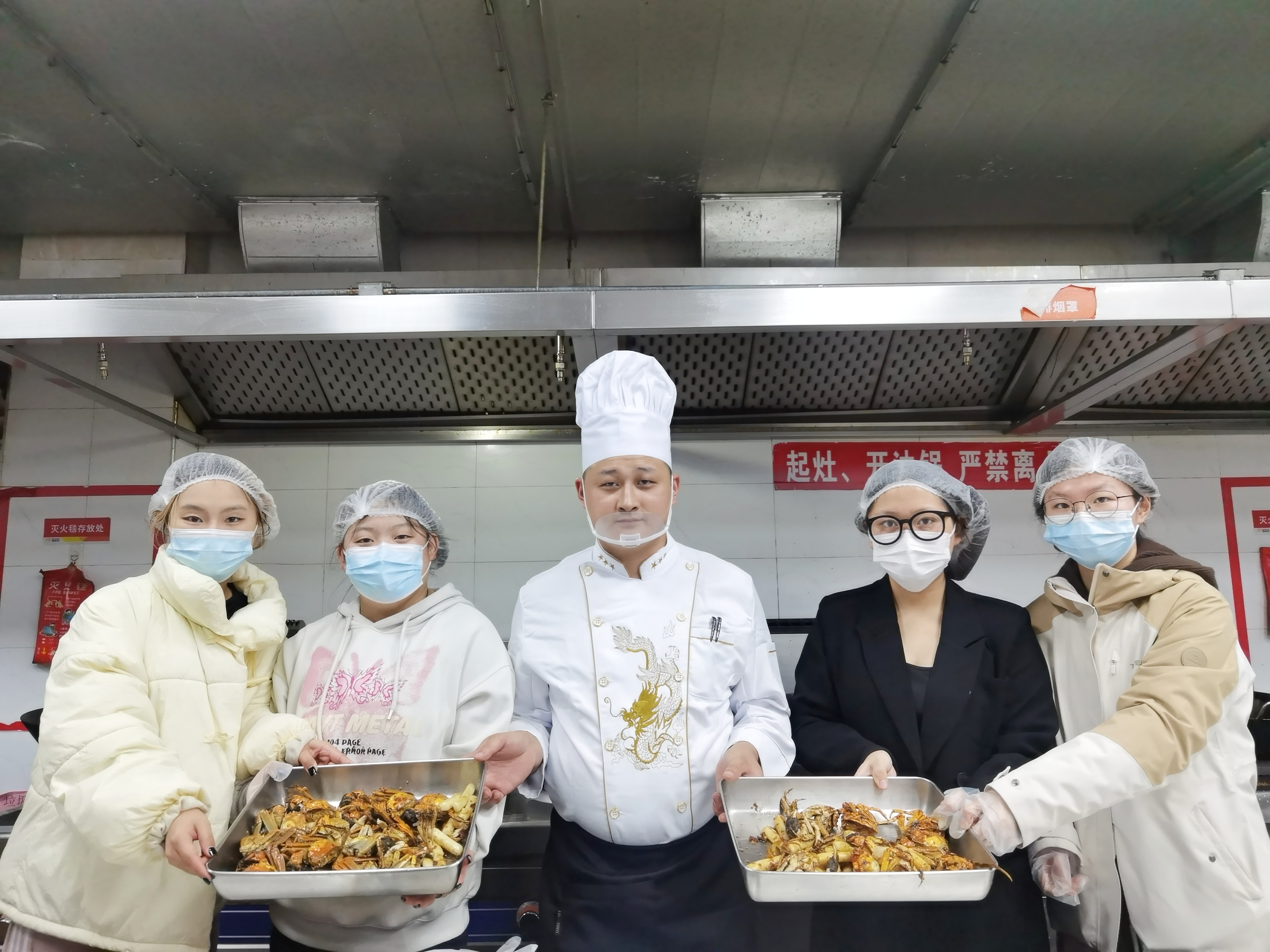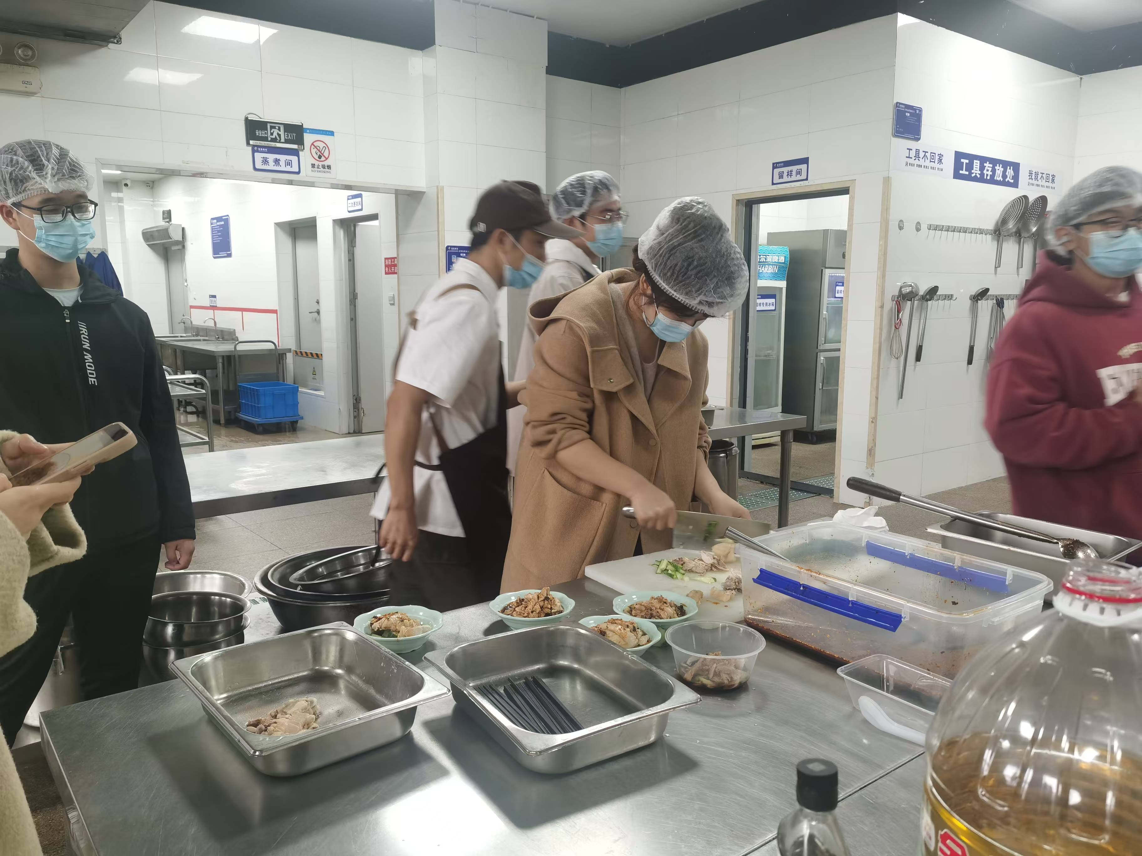 后勤管理处特别邀请了三位具有丰富经验厨师担任指导老师,25位同学现场参与了学习与独立烹饪,分别在桃园餐厅一楼、二楼烹饪了糖醋排骨、口水鸡,在李园餐厅烹饪了毛蟹年糕三道美味佳肴。