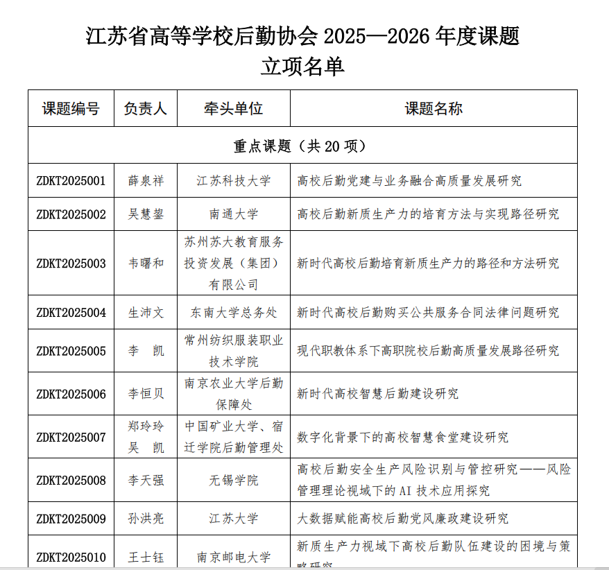 近日,江苏省高等学校后勤协会下发《关于江苏省高等学校后勤协会2025-2026年度课题立项的通知》,经个人申报、学校推荐、专家评审,我校申报的《高校后勤安全生产风险识别与管控研究——风险管理理论视域下的AI技术应用探究》获批重点立项资助课题,实现我校后勤科研实践新的突破。